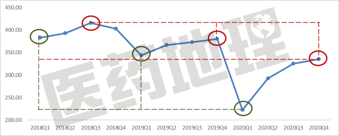 2020年共實(shí)現(xiàn)銷售額1176億元,相較于2019年大幅回落近20%。具體來看,2020年1季度創(chuàng)下了2013年以來的低點(diǎn),雖然從Q2開始一路爬升,但直到Q4也未達(dá)到前兩年的單季度最低值。自2013年起,中藥市場規(guī)模不斷擴(kuò)大,至2017年達(dá)到峰值,在2018年平穩(wěn)過渡后,2019年出現(xiàn)小幅下降,歷經(jīng)2020年疫情最低點(diǎn)后,預(yù)計(jì)2021年將會緩慢回升,但短期內(nèi)無法達(dá)到另一個(gè)高點(diǎn)。