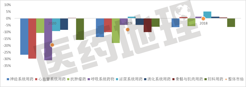 2020年,統(tǒng)計(jì)當(dāng)前的TOP8治療領(lǐng)域增長情況后發(fā)現(xiàn)(以中藥主治疾病的治療大類計(jì)),受整體市場影響,僅有骨骼肌肉用藥出現(xiàn)了極微弱的增長,而其他領(lǐng)域都是負(fù)增長,但程度有所不同,有4個(gè)領(lǐng)域的降幅在市場均值以上(抗腫瘤、泌尿、消化、婦科),僅有2個(gè)領(lǐng)域在近三年的增速均高于市場均值(泌尿、消化)。而神經(jīng)系統(tǒng)用藥作為市場份額第一的治療類別,近三年的增速均低于市場均值。