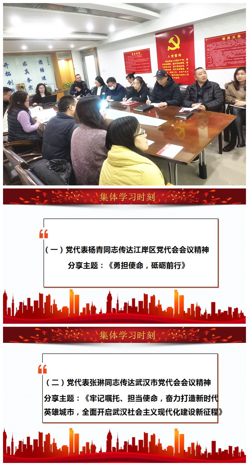本次會議從基本情況介紹、報告主要內(nèi)容和學(xué)習(xí)貫徹要求等三個方面對市、區(qū)黨代會精神進行了深入解讀。會議要求,全體黨員干部要深入領(lǐng)會武漢市第十四次黨代會精神,認真總結(jié)第十三次黨代會以來的先進工作經(jīng)驗,切實領(lǐng)悟今后五年的指導(dǎo)思想和奮斗目標(biāo),全面、完整、準(zhǔn)確貫徹新發(fā)展理念,主動服務(wù)和融入新發(fā)展格局。